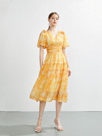 Dress Wholesale French printed V -neck bubble sleeve big swing vacation, photo dress, waist temperam...
