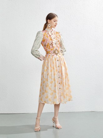 Dress Wholesale Women's new yellow printed cotton high -end dress women's lace on waist long skirt t...