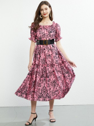 Dress Wholesale Printed dress, ruffled edge skirt, tie up short skirt, women's new summer square nec...