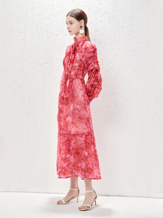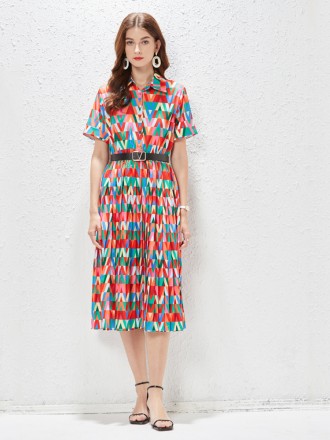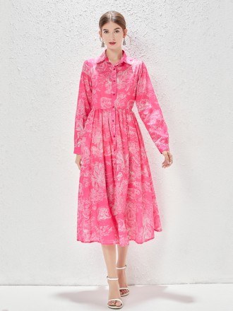 Dress Wholesale Big -printed stitching pleated single -breasted dress, female long -sleeved spring a...