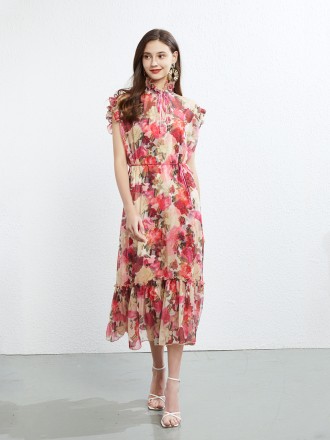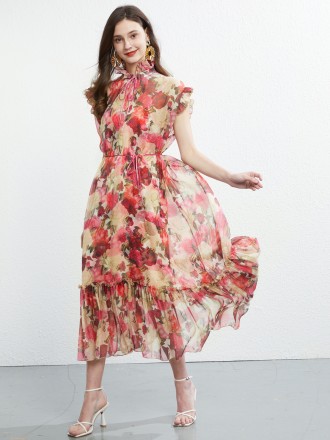 Dress Wholesale Flower long skirt, ruffled dress Vedic short -sleeved printed chiffon large skirt be...