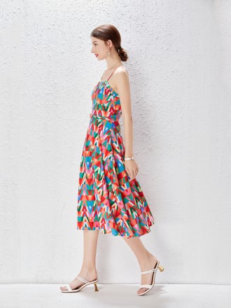 Dress Wholesale Hanging neck chiffon skirt, deep V-neck, backless A-line skirt, beach skirt, floral ...