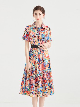 Dress Wholesale Women's lapel shirt dress women's singles buckle color letters print button mid -lon...