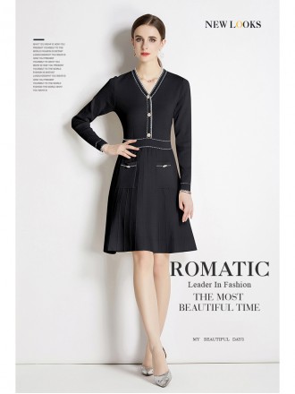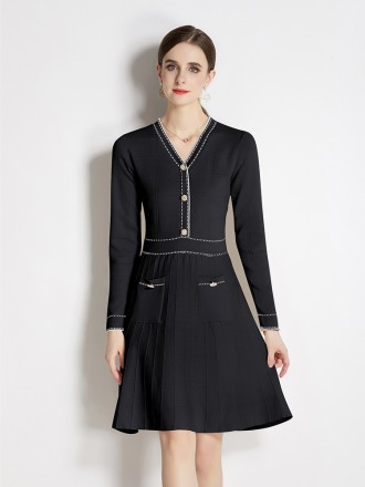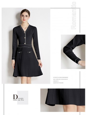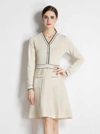 High -end knitted dress in autumn and winter new ladies and temperament thin French V -neck skirt