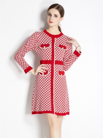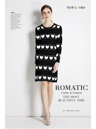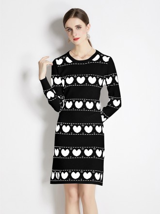 Retro contrasting love round collar Xianxian thin knitted dress women's autumn new middle skirt
