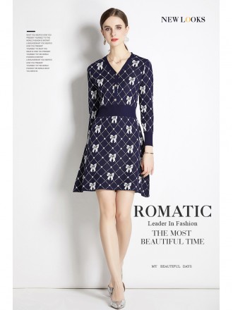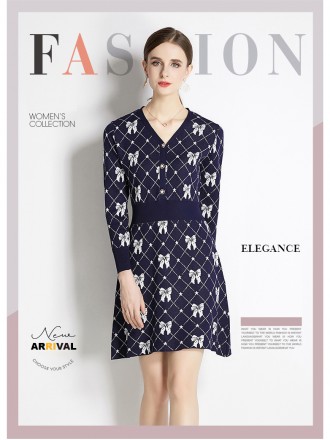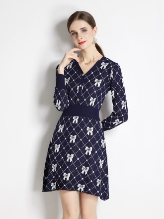 High -end knitted dress autumn and winter new lady temperament is thin French bow small incense skir...