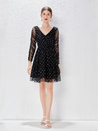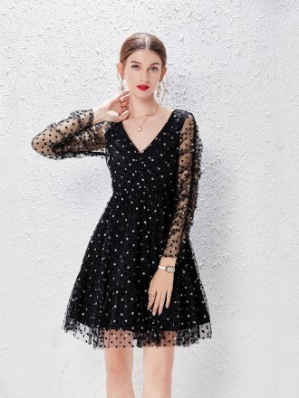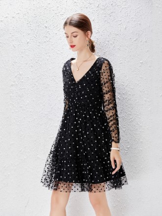 Dress Wholesale Australian niche design Vedic, waist, thin black wave dot dress, A -line gauze skirt...
