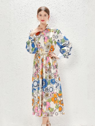 Dress Wholesale Spring and summer new single -breasted long -sleeved long -sleeved dress female prin...