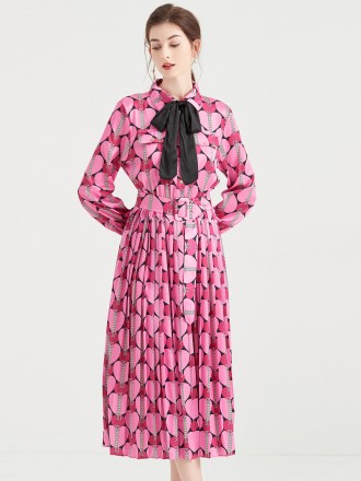 Dress Wholesale Spring and summer new lace -up collar long sleeve positioning printed dress retro te...
