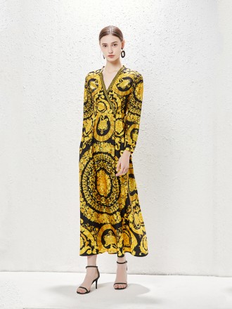 Dress Wholesale Big names of the same temperament golden positioning printed V -neck long sleeve dre...