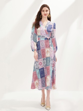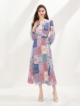 Dress Wholesale Australian brand same dresses, printed lace, V -neck large skirt, long skirt, holida...