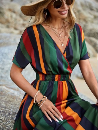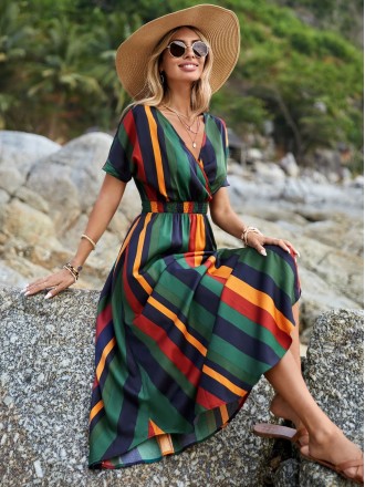 Dress Wholesale The new vertical strip pattern is thin printed Posmian style V -neck long shirt dres...
