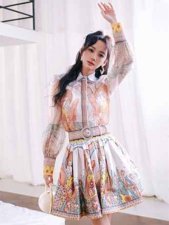 Dress Wholesale The new fashion two -piece lamp sleeve position printing imitation linen shirt+skirt...