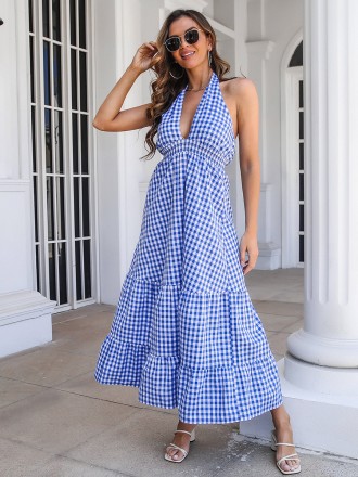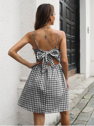 Dress Wholesale Cotton and linen plaid dress with open back ruffled edge, new hollowed out bra style...