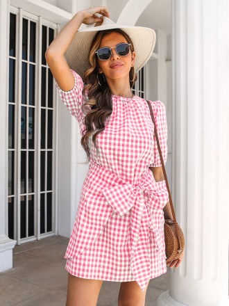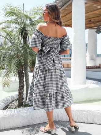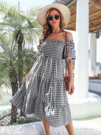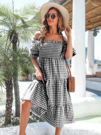 Dress Wholesale Checkered square neck large swing skirt, lantern sleeve, middle sleeve, ruffled edge...