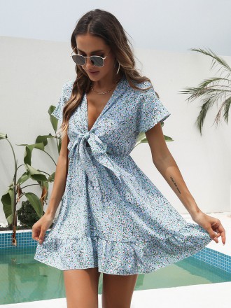 Dress Wholesale Front knot deep V-neck short skirt for women's summer new short sleeved ruffled skir...