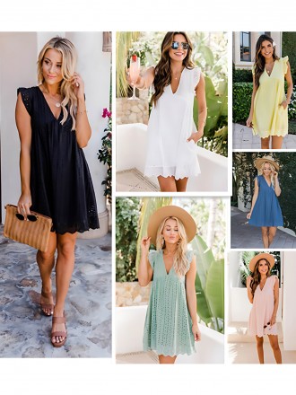Dress Wholesale The new lace jet flower hollow V -neck dress has a pocket cloth shorts in pockets