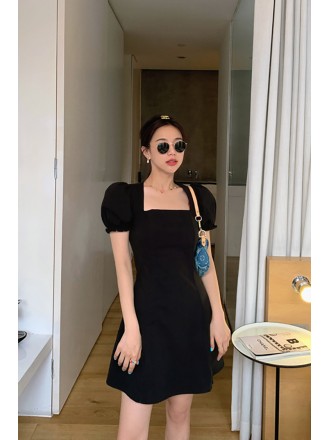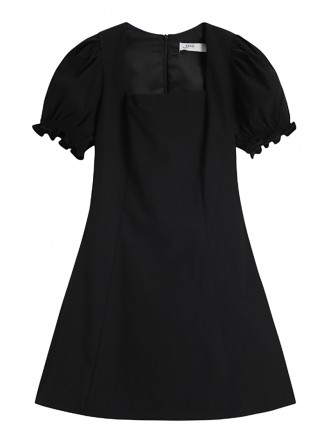 Summer new black high -waisted floral dress female square collar A -line skirt bubble sleeve long sk...