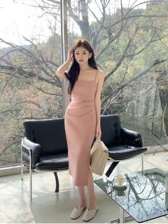 Spring and summer new pink camisole dress fold waist waist temperament high -level sexy hip short sk...