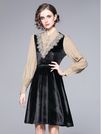Dress Wholesale Spring New V Lace Standing Neck Splice Large Swing A Small Black Dress Retro Celebri...