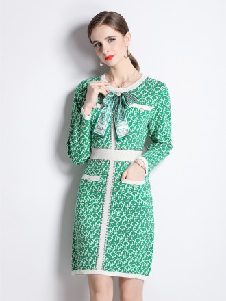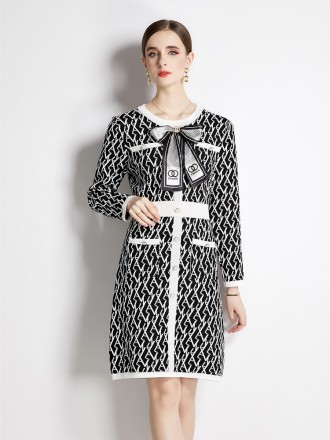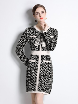 High -end knitted dress in autumn and winter new ladies temperament is thin French tie small incense...