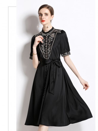 Dress Wholesale Summer new exquisite embroidered small stand -up neck short -sleeved long skirt temp...