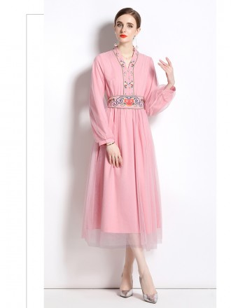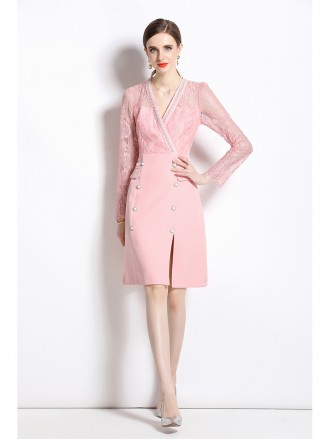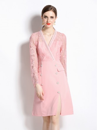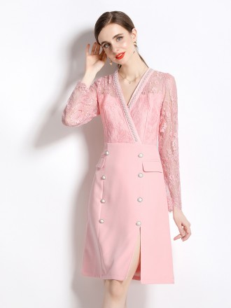 Dress Wholesale Light cooked temperament pink V -neck dress Spring and autumn new high -end ladies f...