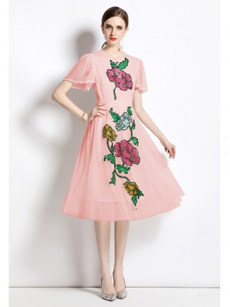 Dress Wholesale Summer new round neck lotus leaf short -sleeved embroidery sequins stereo flower net...